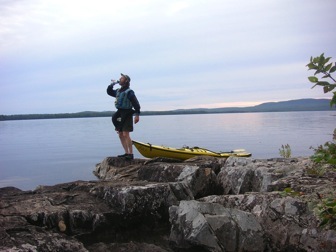 I ripped open a hatch and grabbed my fleece pants, somehow pulling them on over my hiking boots, covering my bare legs. Driven to distraction by the swarm, I leapt into the cockpit, shoved in a few items I was carrying, including my spray skirt, and shoved off. Size twelve hiking boots don’t fit in the cockpit of my kayak. My legs were crossed and toes shoved down beyond the footpegs and I had so much other stuff shoved into the cockpit that I was really crammed in. But on the Penobscot, while the mosquito population was still strong, we paddled away from the swarm and I regained my composure.