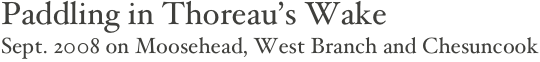 We spent three days and nights making our way north on Moosehead. On the third day our trip was saved by a couple good Samaritans who helped us cross over Northeast Carry to Penobscot Farms (nothing there, just a designation on the map) so we could continue on the West Branch Penobscot. We paddled the West Branch into Lobster Lake and spent two nights at Lobster. We through-paddled to Chesuncook House and laid up there two days waiting for Hurricane Hanna to pass. We caught Chesuncook in a complacent mood, and paddled down to Caribou Point for our last night of camping on the Lake. The eighth day, we ended our trip at the point separating Ripogenus Lake from Chesuncook. We paddled about 90 miles and the dates were 9/1 TO 9/8/2008.